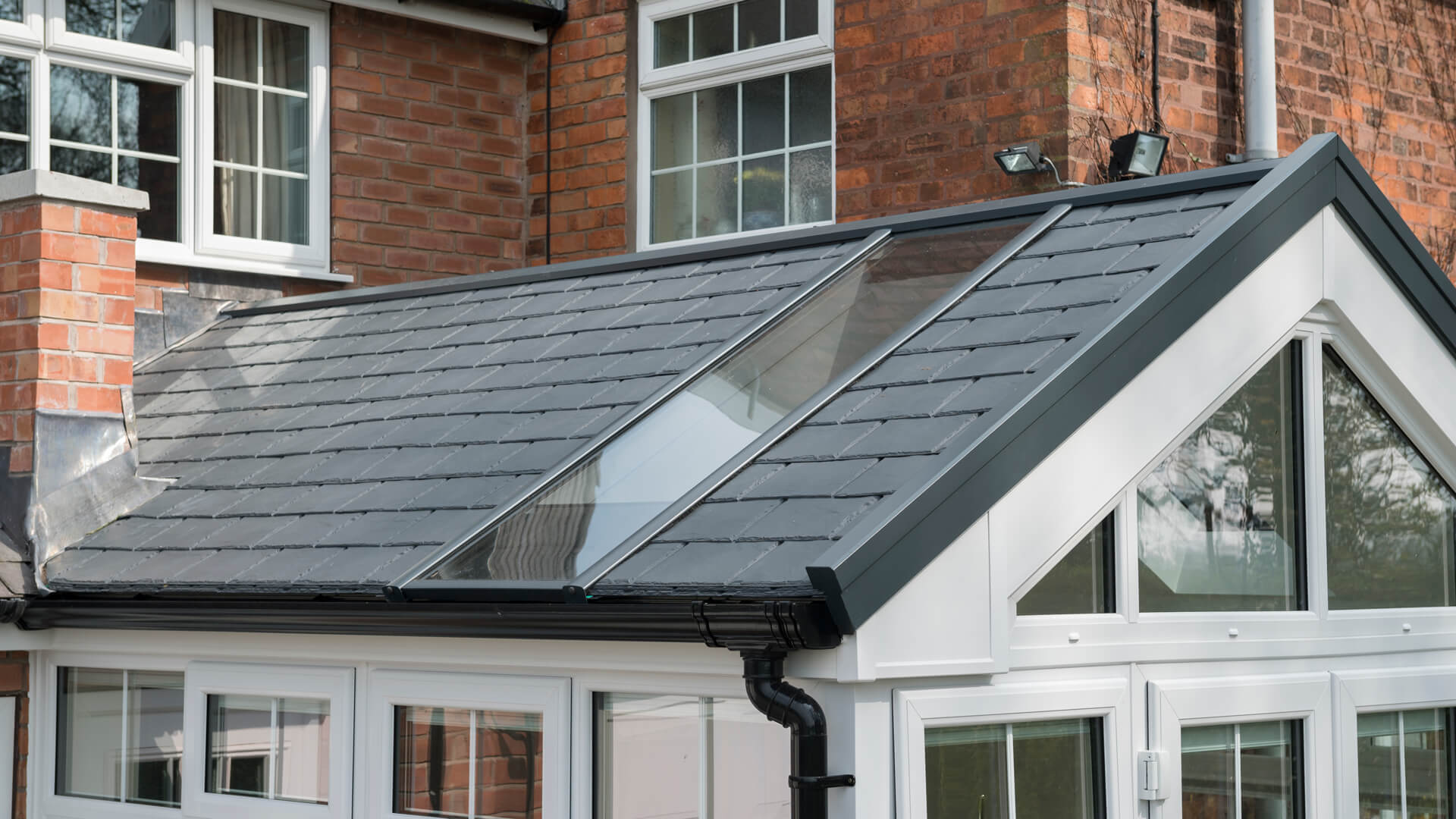 So many things catch your eye when you come face-to-face with this Gable conservatory, from the beautifully intricate Georgian bars to the upgraded guttering. But we’d say the UltraRoof is what stands out most – a revolutionary roofing system. Typically used as a replacement covering, the UltraRoof has glazed sections amongst the lightweight tiles / slates, which overcomes any possibility of natural light being lost from a structure like this. As a substitute for that natural light at night, there are downlighters integrated into the conservatory.